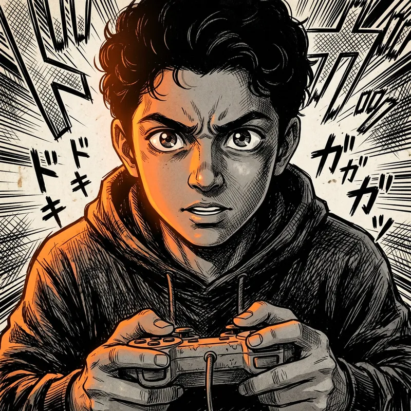 A teenage boy with an intense look on his face is engaged in an exciting video game. The scene is depicted from a chest to head angle. The boy happens to be of Middle-Eastern descent, giving his appearance depth and uniqueness. He is illuminated with an orange neon light, casting dynamic shadows and defining his features. The style of the image is reminiscent of Japanese manga, particularly those from the late-Meiji era manga artists. Japan's complex line work and stylings permeate this illustration, providing a vivid and tell-tale atmosphere synonymous with riveting narratives. In particular, take reference from their visual approach which often included exaggerated proportions and expressionistic touches.