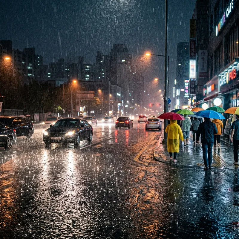 Intense Rainfall in City at Night