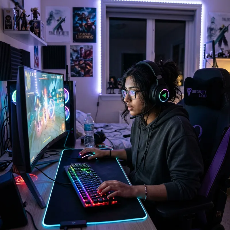Intense South Asian Female Online Gamer on Colorful Backlit Keyboard
