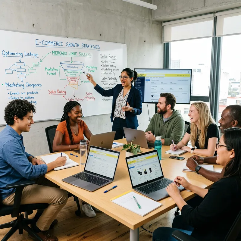 A lively coaching session taking place. The room in which the session is held has a minimalist design with a whiteboard filled with colorful markers and creative diagrams on one wall. People of different descents such as Caucasian, Black, and Hispanic are participating. They vary in gender, some being male and others being female. On the large meeting table, there are laptops opened to the Mercado Libre website. The coach, an intelligent South Asian woman is enthusiastically guiding the session, sharing strategies for success in the e-commerce field.
