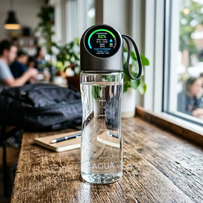 An advanced, smart water bottle made of transparent glass. Its lid is equipped with a high-tech LED screen which indicates hydration levels and other relevant information. The minimalistic and sleek design of the bottle is coupled with its high functionality. The electric components are cleverly hidden within the lid, making it seamless. The display illuminates with bright, visible colors, offering an easy reading experience. The bottle itself is sturdy and robust, designed for daily use. It promotes healthy water intake and makes hydration a fun, interactive experience.