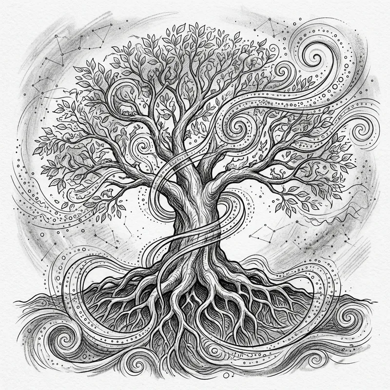 A black and white sketch illustrating the interconnection of the life's energy and the quantum energy. The visual should encompass abstract expressions of energy flow, featuring the representation of life's energy as a tree, with its roots reaching deep and branches stretching wide. Quantum energy should be depicted as a swirl of particles and waves, intermixed and coexisting with elements of nature. There should be continuous lines representing ties and connections between these two energies, signifying the harmony within the universe.