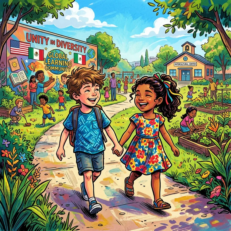 An illustration of a Caucasian boy and a Hispanic girl holding hands, created with vibrant and colorful brush strokes. The children have joyful expressions and the style is reminiscent of a comic book. The image is captured as if it's a photograph with natural light and a wide-angle lens used to encompass the entire scene. The overarching theme is intercultural education.