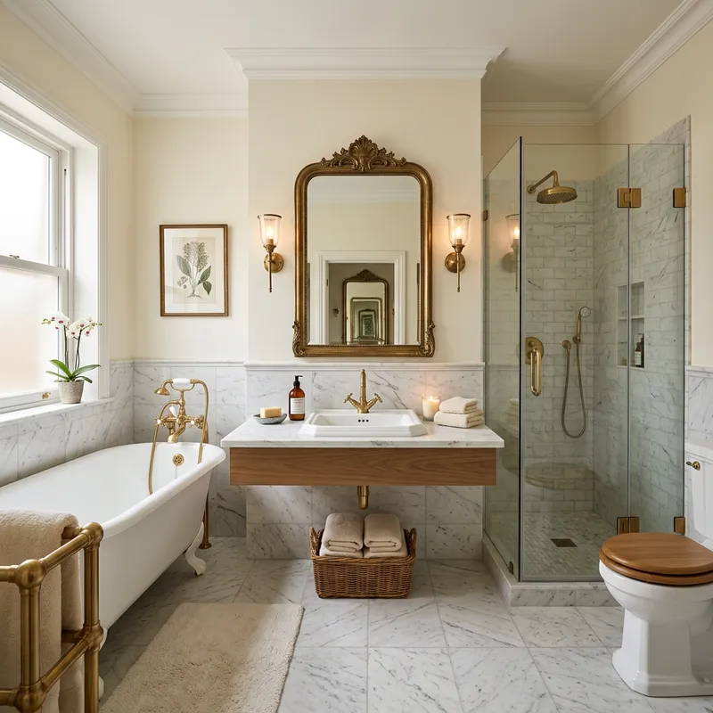 A meticulously designed interior of a bathroom. This custom space comprises modern amenities with a dash of classic charm. The scene might include a large ceramic sink, a luxurious bathtub with ornate fittings, a high-quality porcelain toilet, and a spacious shower area with a glass door. A large mirror awaits atop the sink, reflecting the warm light of stylish wall scones. Marble tiles grace the floor and partially up the walls, transitioning into tastefully chosen wall paint. Final touches include plush towels, sophisticated soap dispensers, and elegant decorative items.