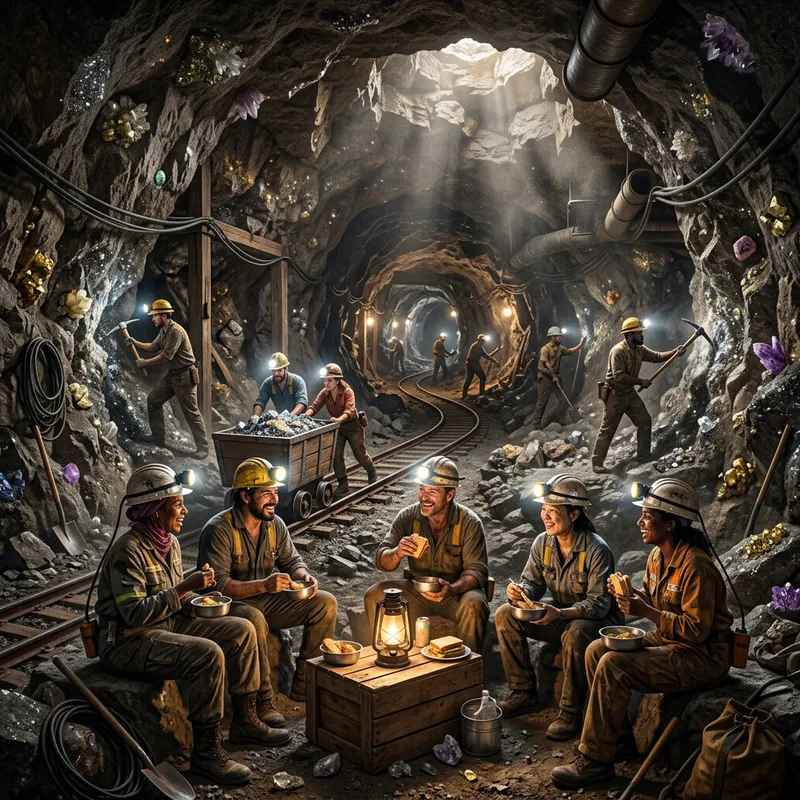 A subterranean scene depicting a large, intricate system of tunnels and caves. Along the walls of the tunnels, there are glistening minerals and gems. You can see miners of mixed genders and diverse descents such as Hispanic, Caucasian, East Asian, Middle-Eastern, and so on, working with picks and shovels, their faces lit by the glow from their helmet-mounted lamps. A mining cart filled with ore is on a rail track leading downwards. Light filters in from small cracks in the ceiling, revealing a cloud of dust in the air. Near the foreground, a group of miners is taking a break, sitting around a lantern and sharing a meal.