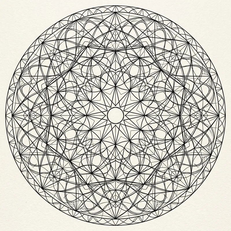 Design an intricate piece of circular artwork, making abundant use of a variety of chords, arcs, and angles within the circle. Create a unique design, potentially resembling a mandala, with diverse layers, shapes, and symmetry. Please refrain from using colors in order to focus on the geometric aspects of the artwork and give it an intricate yet minimalist aesthetic.