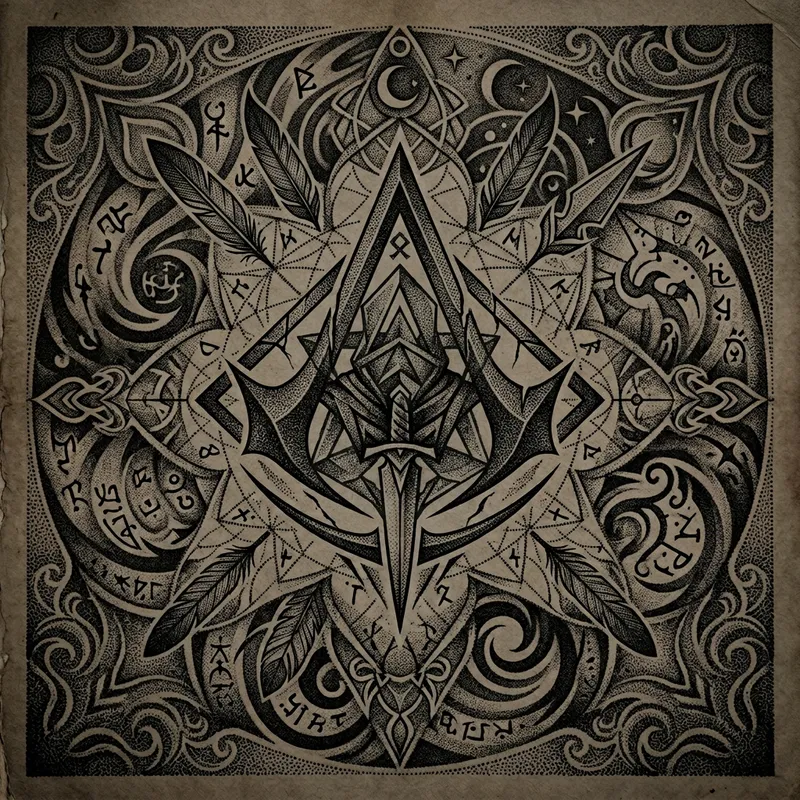 Generate an intricate dotwork design symbolizing mystery. The centerpiece of this design should be a minimalistic logo in the style often seen in assassin-themed fiction, with sharp angles and shadowy elements. However, it's important to note that it should not resemble copyrighted symbols but be a unique creation in its entirety.