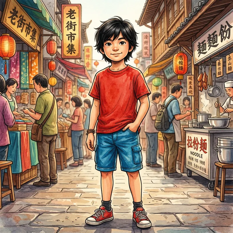 An intricate illustration of an East Asian boy around the age of 12 with medium-length black hair. He's standing with a confident stance, one hand nonchalantly tucked in the pocket of his vivid blue denim shorts. He's wearing a vibrant red t-shirt, adding a lively contrast to his casual outfit. His facial features are distinctively more rounded, enhancing his youthful appearance. His gaze is direct and curious, as if he's looking straight into the viewer's eyes, reflecting his inquiring mind and eager spirit.