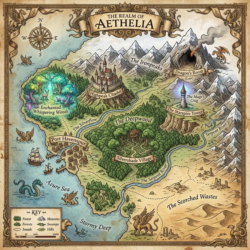 Generate an intricate image of a fantasy Dungeons and Dragons map. The map should feature a variety of landscapes such as towering mountains, expansive forests, winding rivers, and sprawling deserts. Also include several settlements, such as a formidable castle on a hill, an isolated mage tower, a bustling port town, and a hidden village in the heart of the forest. Label these areas in a classic mythical style. Finally, add a few fantastical elements like a dragon's lair in the mountains and an enchanted forest.