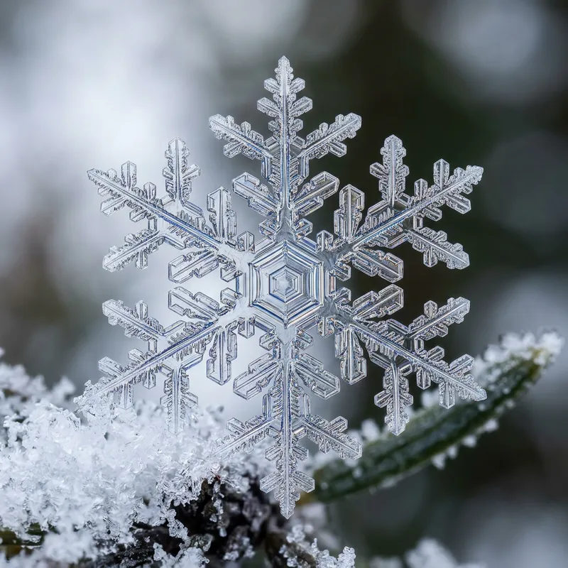 An accurately depicted snowflake, exhibiting exquisite geometric symmetry. The snowflake is delicately enhanced with subtle hints of color sprinkled throughout its crystal patterns, adding to its natural beauty.