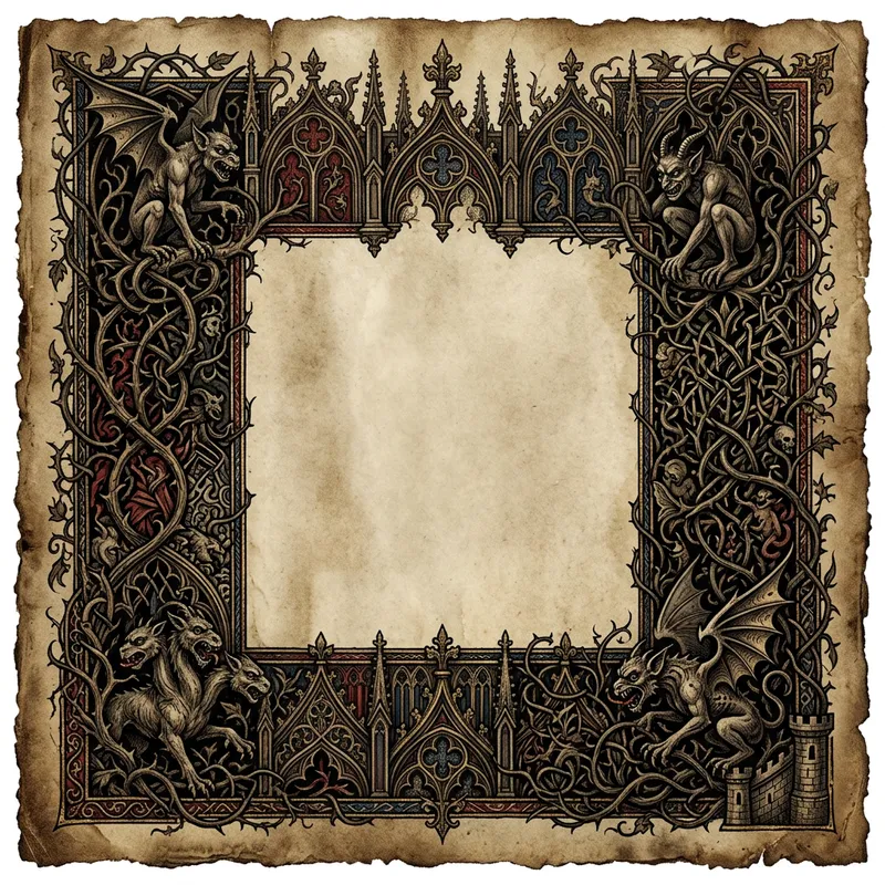 A intricate gothic page border. The design includes peculiar gargoyles, twisted vines, and sharp linear patterns that evoke the grimness and grandeur of Gothic architecture. The border is dense with detail, each corner decorated differently perhaps with a gargoyle amidst the vines. The vines seem to grow in maze-like patterns, entwining the gargoyles. This piece must feel like it was ripped straight from a gothic medieval manuscript, dark yet beautiful.