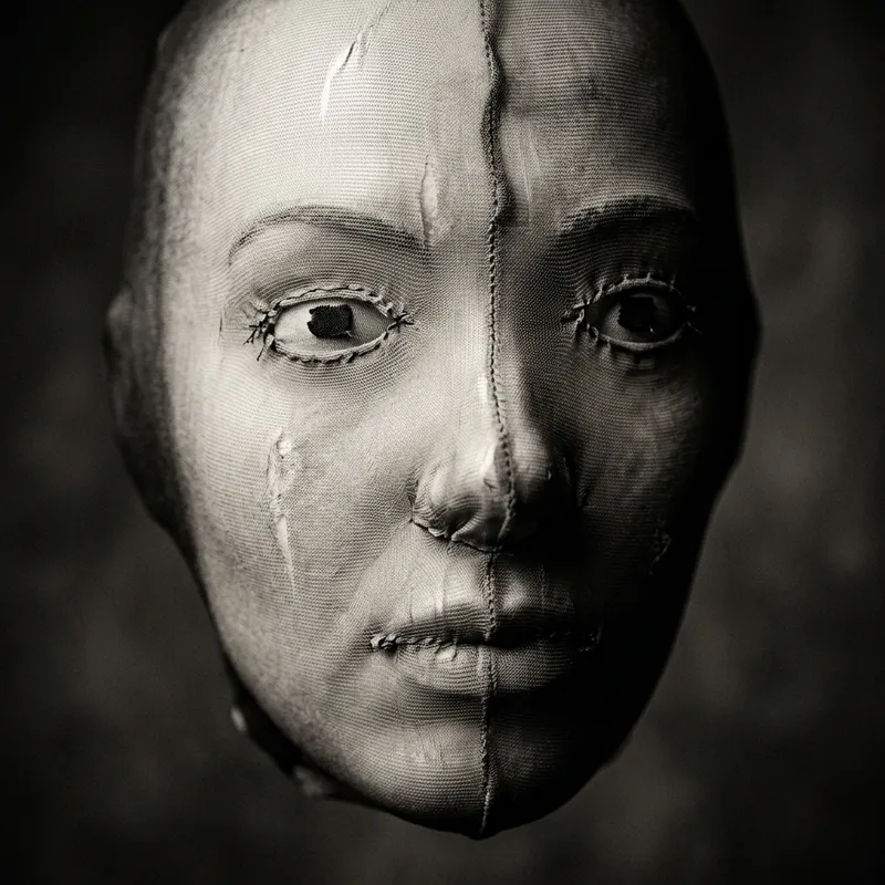 A close-up photo emphasizing the intricate details and texture of a handmade mask made out of pantyhose. The mask is meticulously designed to resemble a human face, with clear indications of eyes, nose, and mouth. This minimalistic aesthetic augments the sense of changeable identity. The photo, taken in high contrast black and white, allows the dramatic lighting to put a spotlight on the pantyhose's thin and elastic material. The entire composition is a contemplative exploration of transformation and disguise, akin to the surrealist artworks typical of the early 20th century. The image is shot with a Canon EOS R5, a macro lens and has an avant-garde feel to it.