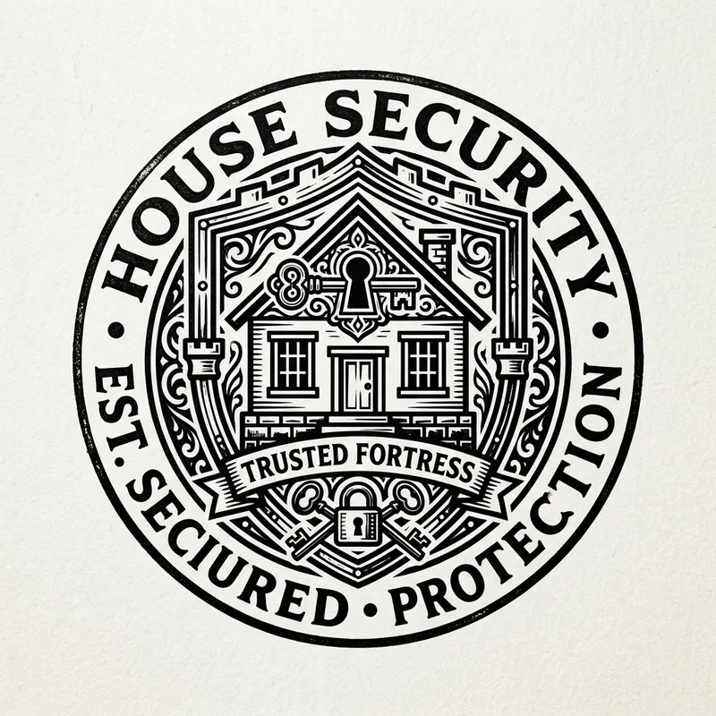 An intricate logo design representing house security suitable for a stamp imprint. The logo should include key elements that symbolize both a house and security, such as a stylized figure of a house integrated with a lock or shield. The design should be bold, detailed, and clear so as to be suitable for a crisp, clean imprint. Maintain a monochromatic scheme in black and white.