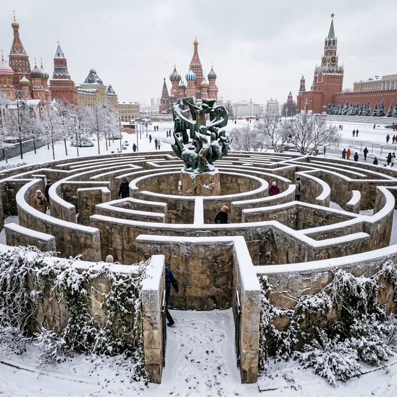 An intricate installation in the form of a labyrinth set in a city resembling Moscow. The labyrinth is designed intricively with high stone-walled pathways and twists and turns. At the center, there's a captivating discoloured bronze sculpture. The labyrinth's entrance is decorated with ivy clinging to the stone walls. The cityscape in the background includes ornate, historical buildings, colourful domes, and elongated spires, hinting at the architecture typical of Moscow. Snow gently dusts the labyrinth, cityscape, and the ground, capturing the chilly aura of Moscow's winter.