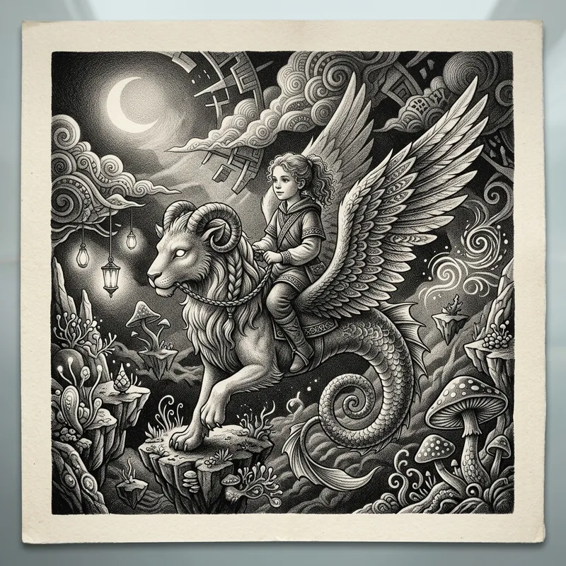Captivating Lithograph: Girl on Mythical Creature in Surreal Dreamland