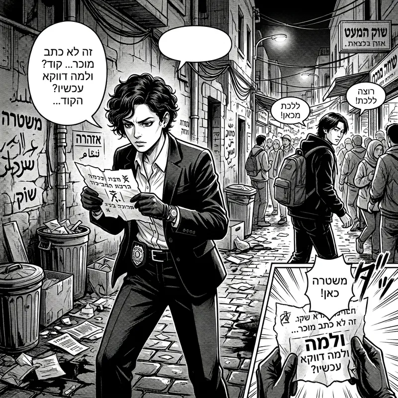 An intricate manga panel illustrating a compelling scene. The panel features an Israeli female detective with short curly hair and a stern expression, wearing a neatly pressed suit, standing in a dimly lit alleyway strewn with remnants of a chase. She's perusing a cryptic clue left behind. At the other end, an Asian male with medium-length hair, dressed in casual attire, is discreetly blending into the crowd. The scene is filled with tension and intrigue, and the realistic art style amplifies the emotional intensity. The speech bubbles indicate a lively conversation. No explicitly identifiable characters or symbols from existing media are present.