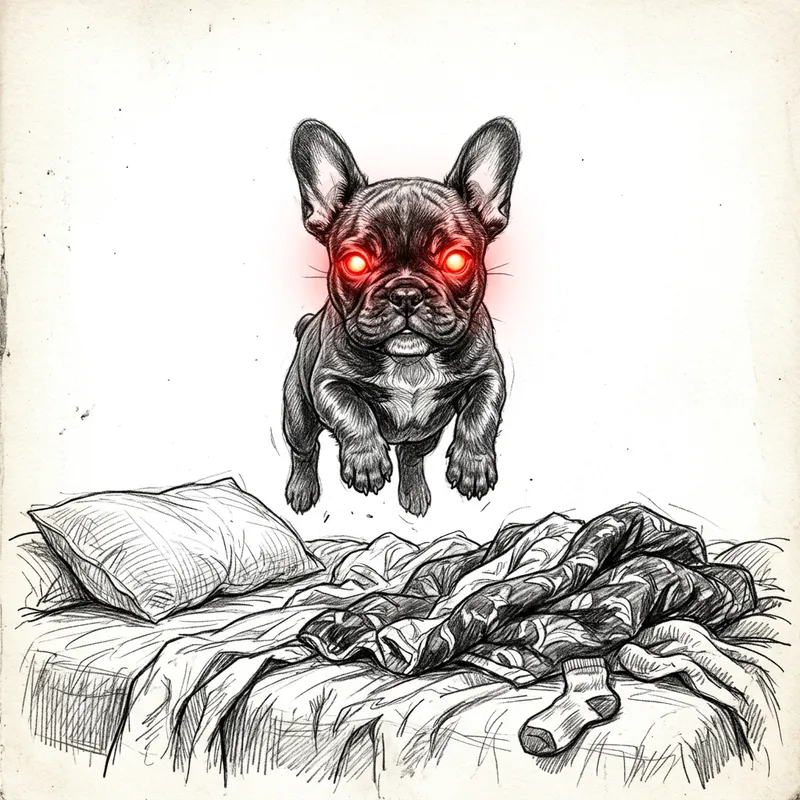 Generate an intricate and unnerving pencil sketch of a monochromatic French Bulldog puppy in tones of black, gray, and white. The puppy appears to have mystical powers, with its eyes enchanted with a bright red glow as it floats above a bed. The background is rendered in stark white, creating a stark contrast that underscores the puppy's extraordinary presence. The overall composition conveys a sense of whimsy intermingled with an unsettling aura, with a dash of dark humour conveyed subtly.