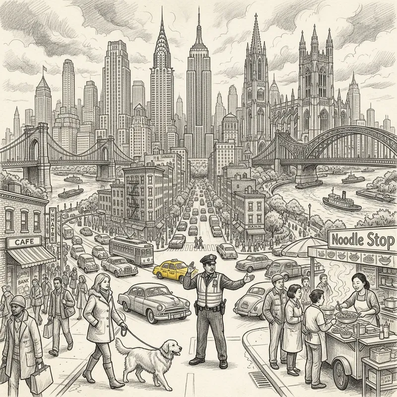 Imagine an intricate pencil sketch of a bustling city. The labor of dedicated architects is evident in the skyline, brimming with towering skyscrapers from various historical eras - notably Art Deco and Neo-Gothic. In the streets below, an array of diverse individuals, including a Hispanic male police officer directing traffic, an Asian female vendor at a food stall, and a Caucasian woman walking her dog, animate the urban landscape. Majestic bridges connect different city sections over a winding river, and scattered trace of flora soften the brick jungle. All are rendered with the fine detail only achievable with a graphite pencil on quality drawing paper.