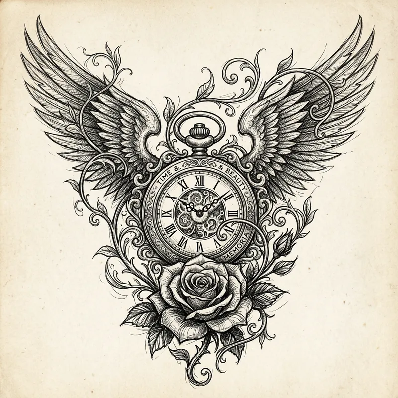 Design a sketch-style tattoo. The tattoo design should be intricate and include various elements such as a pair of wings, a rose, a clock, and vines intertwining between all the elements. It should reflect the aesthetics of vintage illustrations with fine lines and detailed shading. The output should be grayscale to mimic the classic black ink used in real tattoo drawings.
