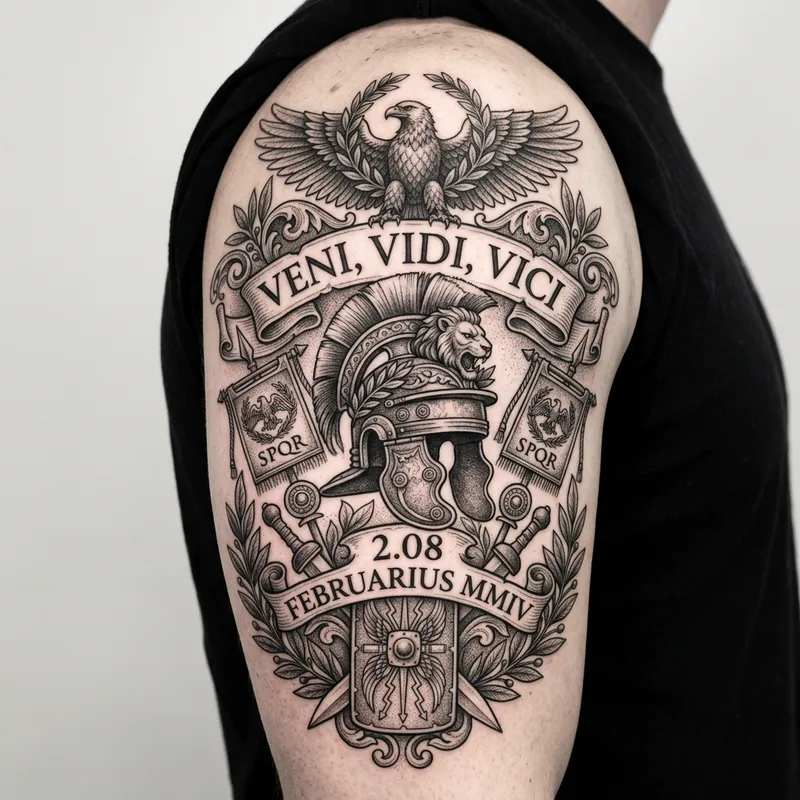 An intricate tattoo design that features the Latin phrase 'Veni, Vidi, Vici', which translates to 'I came, I saw, I conquered'. In the design, the numbers '2.08' are also incorporated. The design elements could include classical Roman motifs such as laurel leaves, a Roman soldier's helmet or legionary standards.