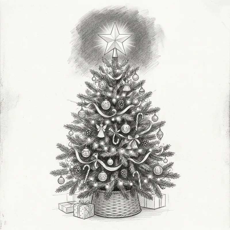 Please create a beautiful vision of a Christmas tree. The tree should be intricately decorated with various ornaments and fairy lights, offering a magical and festive sight. It should be designed with a star on top that glows brightly against a dark background. Give it a pencil-drawn style, as if it was created with utmost precision using a graphite pencil on a clean, white sheet of paper, the details being softly shaded and crafted with fine lines.