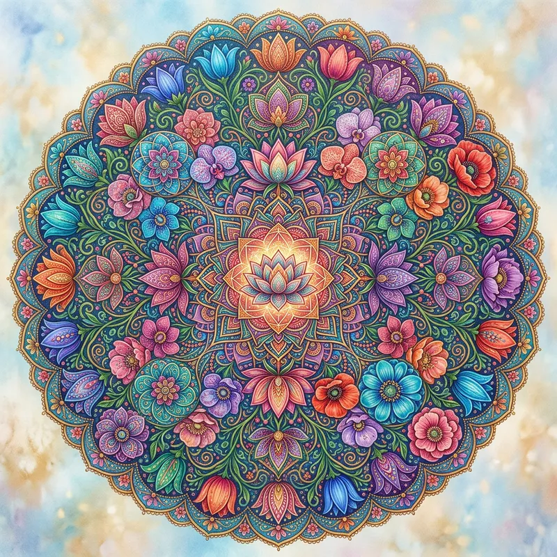 Create an image of an intricately designed mandala with floral elements. The mandala radiates from a central point with a symmetrical pattern encrusted with a variety of imaginative flowers, each with distinctive shapes and patterns, beckoning the eye to explore further. Highlights of fractal patterns interwoven with organic floral details, creating an interesting interplay of geometry and nature. Make the design richly detailed, and incorporate an array of vibrant and soft colors to enhance the impact of the patterns and the overall aesthetic of the mandala.