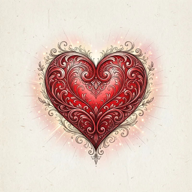 An intricately rendered heart. The detailing is reminiscent of a beautiful, ornate sketch, the soft lines and delicate strokes capturing the universal symbol of love and affection. Its vibrant red color stands out against an unobtrusive, neutral background. It leans towards an almost photorealistic style yet retains an artistic touch that sets it apart from a mere anatomical depiction. It pulsates metaphorically with every beat, embodying the sentiment that love is the lifeblood of human experience.