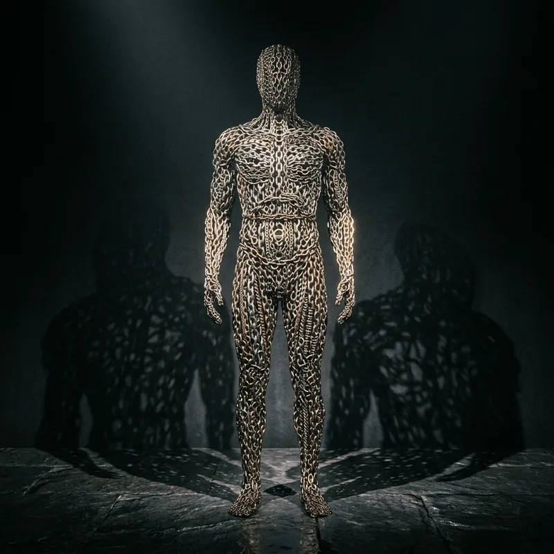 An abstract representation of metallic chains forming the shape of a human body in a neutral stance. The chains are intricately woven to give form to the limbs, torso, and head. The background fades into shadow, highlighting the gleaming chains. Focused light makes the chains appear luminescent and casts long, intricate shadows.