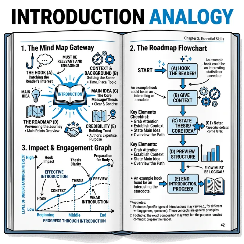 Create an abstract representation of an introduction analogy, presented as a textbook page. The page should be white, with black and blue text. Several types of diagrams like flowcharts, graphs and mind maps may be included to convey the concept. A notable feature should be the large, bold title at the top, reading 'Introduction Analogy'. The page should also include bullet points, annotations, and footnotes to assist in the understanding of this analogy.