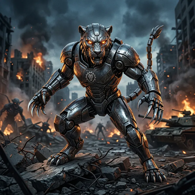 An iron-formed feline, imagined as a member of a heroic team, showing its combat readiness. The feline figure, made entirely of gleaming, hardened metal, stands upright in a fierce battle stance. Its eyes glow with a fiery determination, a set of retractable steel claws extends from its paws. It is ready to leap into battle, displaying both agility and sheer power. The backdrop is a chaotic cityscape in the midst of a faceless threat, emphasizing the bravado and valor of this unique superhero.