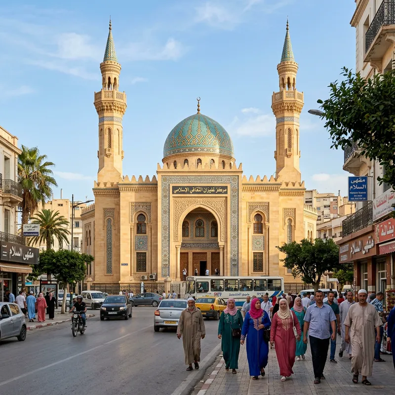 A visual representation of an Islamic cultural center located in an Algerian city known as Relizane. The building exterior should indicate clear Islamic architectural influence, with features such as domes, minarets, and intricate geometrical patterns adorning the facade. The surrounding area should show a typical urban Algerian environment with a bustling city street with local pedestrians of diverse genders and descents. Ensure it's daytime, with ample sunlight causing the center's architectural details to glow softly.