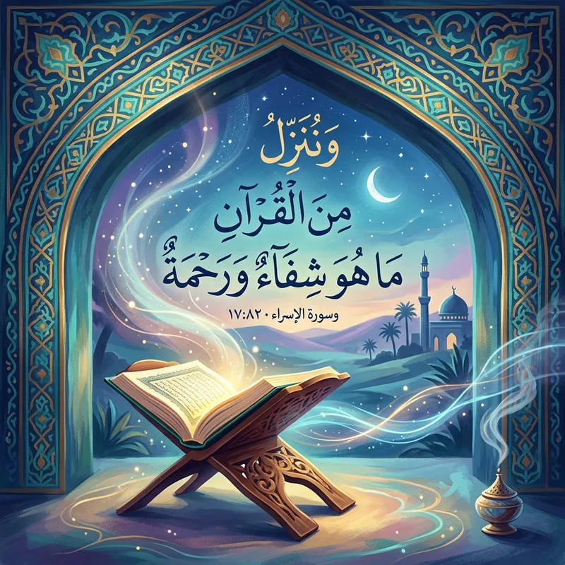 Generate a landscape-oriented image for an Islamic YouTube channel, focused on Ruqyah and Quran recitations. This image should be visually engaging and represent the channel's theme effectively to enhance visibility on YouTube's algorithm. It could include elements such as traditional Islamic motifs, Arabic calligraphy of Quranic verses, and symbols of peace, healing and spirituality.