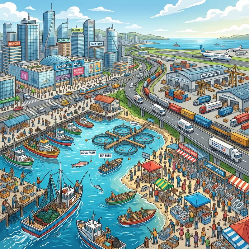 Illustrate a bustling scene depicting a modern era where information technology companies and busy shopping malls co-exist. Alongside, portray a blooming fishing harbor with fishing boats dotting the water, fishermen trying their luck, whilst some boats returning with their catch. Include a marine aquaculture farm where various species of fishes are bred. Also, portray a thriving seafood marketplace where buyers and sellers are haggling over prices. Lastly, visualize a sophisticated logistics network busy transporting goods around, with delivery vans, trucks, cargo planes, and warehouses, efficiently managing flow of goods from one location to another.