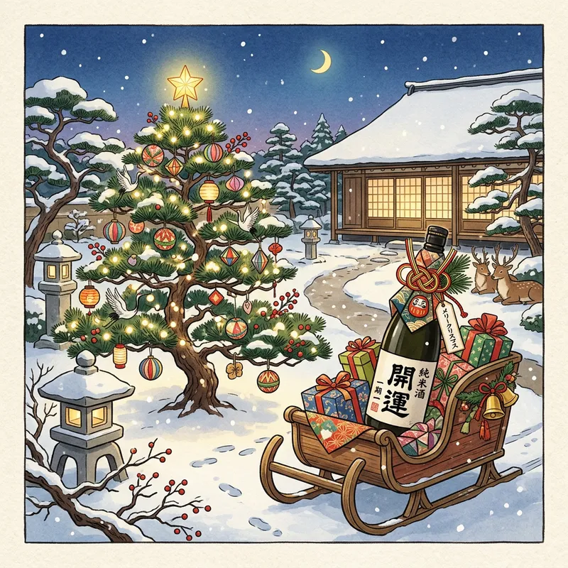 Imagine an illustration in the style favored by the Japanese aesthetic. In the scene, there's a beautifully adorned Christmas tree, decked out in twinkling lights and colorful ornaments. Nearby, Santa Claus' sleigh is parked, brimming with gifts. One of the gifts is unique - a bottle of traditional Japanese sake, wrapped in festive decor. The scene is both serene and joyful, capturing the fusion of Western and Japanese culture during the holiday season.
