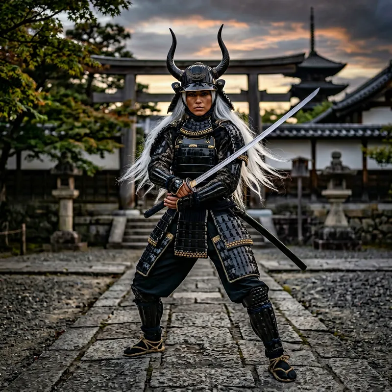 A Japanese samurai woman with a Hispanic descent, dressed in detailed black armor that features sculpted horns on the helmet. Her hair is long, flowing and white, providing a stark contrast against the dark armor. In her grip is a full-length, traditionally made katana. She confidently holds the katana, displaying a pose that suggests readiness and skill.