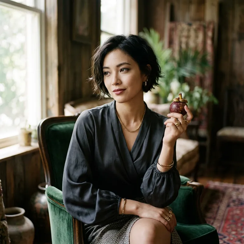 A Japanese woman dressed in stylish clothing, holding an exotic fruit, in the style of fashion photography. The scene is characterized by soft lighting, delicate poses, and a mysterious facial expression. The setting is reminiscent of being shot with a Nikon Z7 camera using a 50mm lens, and the atmosphere exudes a glamorous vibe