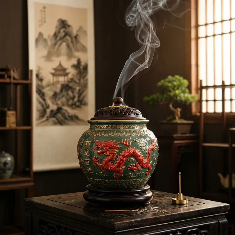 Picture a beautifully crafted jar of Chinese incense, featuring intricate designs. This jar is adorned with an eye-catching embossed red dragon, representing power and luck in Chinese culture. A delicate wisp of smoke is rising up from the jar, symbolizing the burning incense within. The smoke creates a mysterious and peaceful atmosphere around the piece.