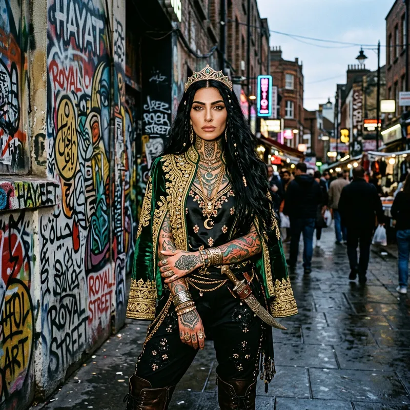 An image of a woman resembling a princess with a Middle Eastern heritage, vibrant tattoos covering her skin. Her beauty is mesmerizing and she emits a fierce aura akin to a real street gangster. Her outfit is inspired by royal attire, and she has long, flowing black hair. Her surroundings hint at a bustling cityscape, filled with graffiti-clad buildings, further accentuating her 'street' aesthetics.