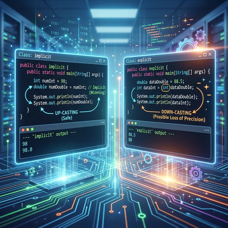 Generate an image showing a Java coding program with two classes named 'implicit' and 'explicit'. The program is written such that when it runs, it displays the following output: For the 'implicit' class, it shows 98 and 98.0, and for the 'explicit' class, it displays 88.5 and 88.
