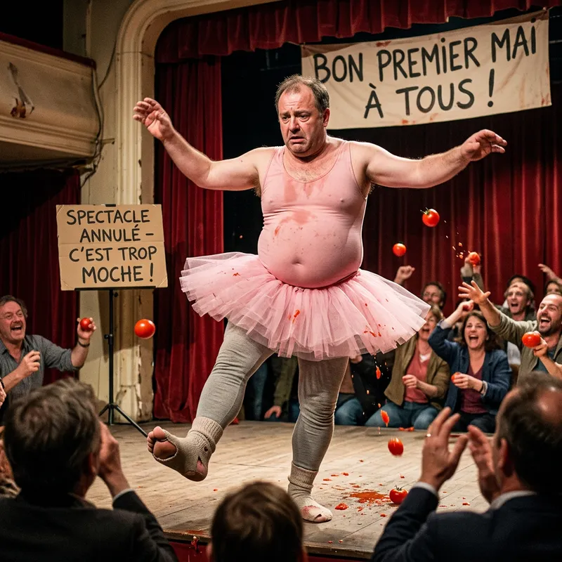 I would like a humorous photo of this person as a dancer in a pink tutu with an overflowing belly, in imbalance. With a holey sock, a canceled show poster because it's too ugly, a crowd in a frenzy throwing tomatoes, and an inscription wishing everyone a happy May 1st.