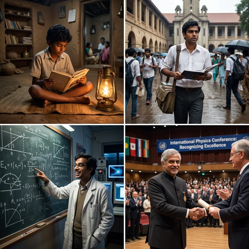 Experience the journey of a world-renowned physicist through captivating visuals. Imagine a humble beginning in a traditional Indian household, where a young South Asian boy is passionately studying under a dimly lit lamp. Progress through the successful moments of his life - his initial challenges, his relentless pursuit of knowledge, the joy of discovery, the recognition and awards. Visualize moments like receiving a prestigious science award, speaking at international conferences, teaching at universities, each moment symbolic of his legacy and contributions to science.