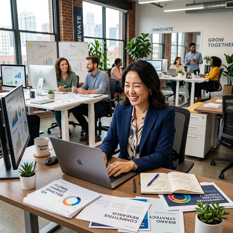 A joyful Asian marketing manager, dressed in sharp professional attire, sits at a modern office workspace. They are lost in their work, displaying an infectious level of happiness. The area around them is filled with essential office gadgets, stacks of marketing researches, strategy papers and a laptop with marketing data on the screen. A few of their colleagues can be seen working around them in a vibrant, equally enthusiastic environment, reflecting the positive work culture.