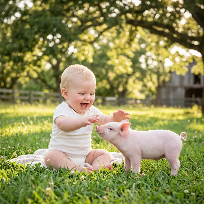 A joyful scene featuring a chubby, blonde-haired Caucasian baby giggling with glee while playing with a small, pink piglet. The baby, wearing a soft white onesie, is sitting on a plushy green grass, extending tiny hands towards the piglet. The piglet, with its bright pink skin, cute snout, and curly tail, looking curiously at the baby and seems to enjoy the interaction as well. Soft sunlight filters through the overarching leafy trees, casting a warm, pleasant glow over the baby and the piglet, enhancing the friendly and playful atmosphere of the scene.
