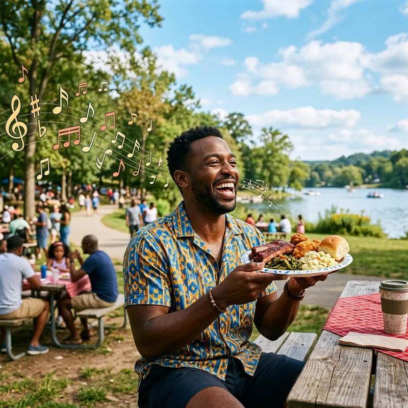 Create an image of a Black man enjoying himself at a park, he's laughing heartily with a plate of delicious food in one hand. Music notes are visible in the air, signifying an unseen source of lively music. The park is filled with trees and a clear blue sky; a serene lake nearby. The atmosphere is full of joy, positivity, and the warmth of a sunny day.