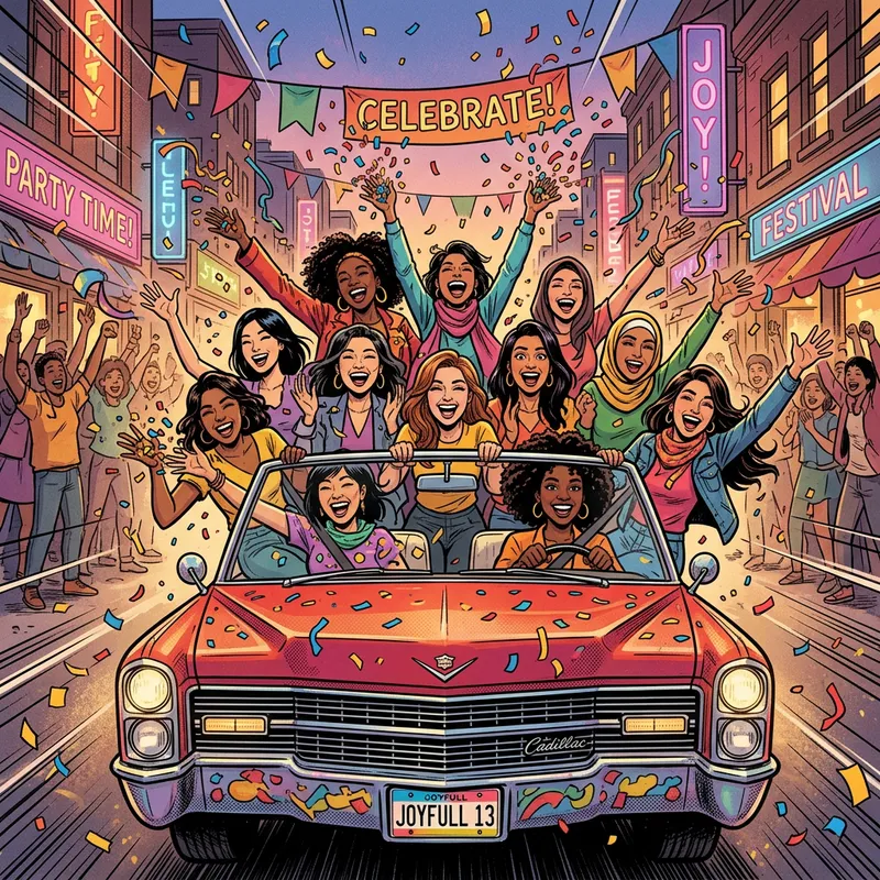 Thirteen women of various descents are joyfully driving in a car and celebrating. They are tossing confetti into the air. The image is in a comic style and focuses on a frontal view of the scene.