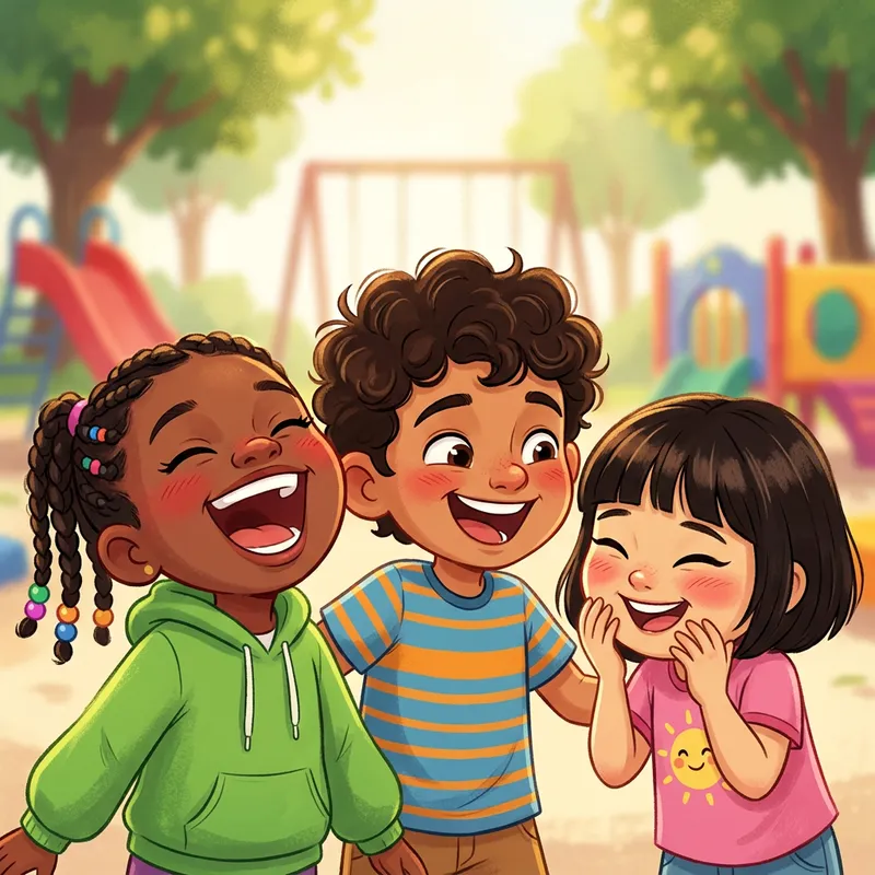 Create a cartoon illustration of three children of various descent and gender. They are engaging in hearty laughter, their eyes sparkling with joy and cheeks rosy from the inherent gaiety. Behind them, a soft background showing the vague outlines of a playground, hinting at an atmosphere of fun and enjoyment.