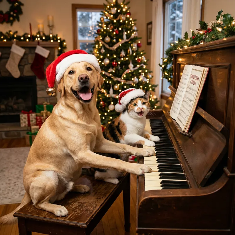 Photo of a three-colored cat and a Labrador dog, both joyous with Christmas hats, playing the piano together.