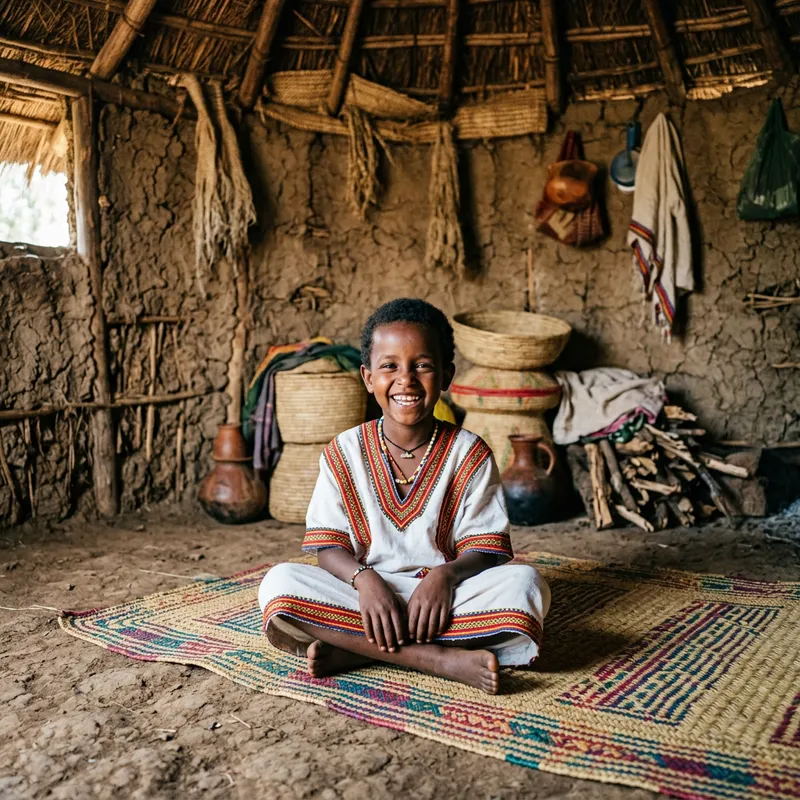 A vibrant image of a young Ethiopian boy possessing dark skin and short black hair, donned in traditional attire, comfortably seated on a beautifully crafted natural woven mat. He's exuding joy and happiness. Behind him, the humble interior of a mud and straw hut serves as a silent testament to his rural lifestyle. The simplicity of the interior with rugged textures and neutral tones conveys the raw beauty of rural Ethiopian life.