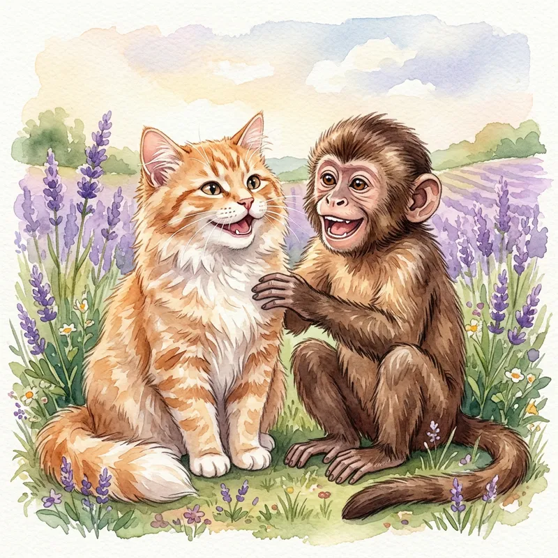 Watercolor painting of a fluffy domestic ginger cat and a playful brown monkey, both engaging in a friendly interaction. They are sitting beside each other against a tranquil lavender background. The cat is on the left and the monkey is on the right. Both animals have uplifted corners of their mouths, clearly expressing joy and happiness, giving the appearance of smiling. Their eyes sparkle with joy and companionship, reflecting the strong bond of interspecies friendship between them.