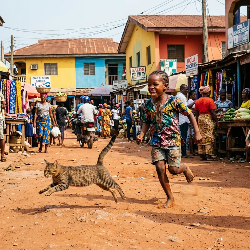 A young Nigerian child of indeterminate gender, full of joy and playfulness, is seen chasing after a nimble and quick cat. The backdrop of this lively scene is a busy street in Nigeria, characterized by a blend of vibrant, bustling markets amidst colorfully painted houses. The bright sunshine casts an effervescent glow on the playfully running duo. The cat, with its sleek, agile body and furry coat, leaps and swerves in its playful escape, while the child follows eagerly, laughter ringing out into the day.